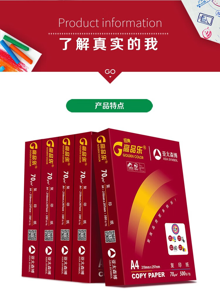 ¥129.00亚太森博亮丽打印纸复印纸白纸一包500张整箱5包2500张办公用纸70克 亮丽A4-70g-8包装(4000张)