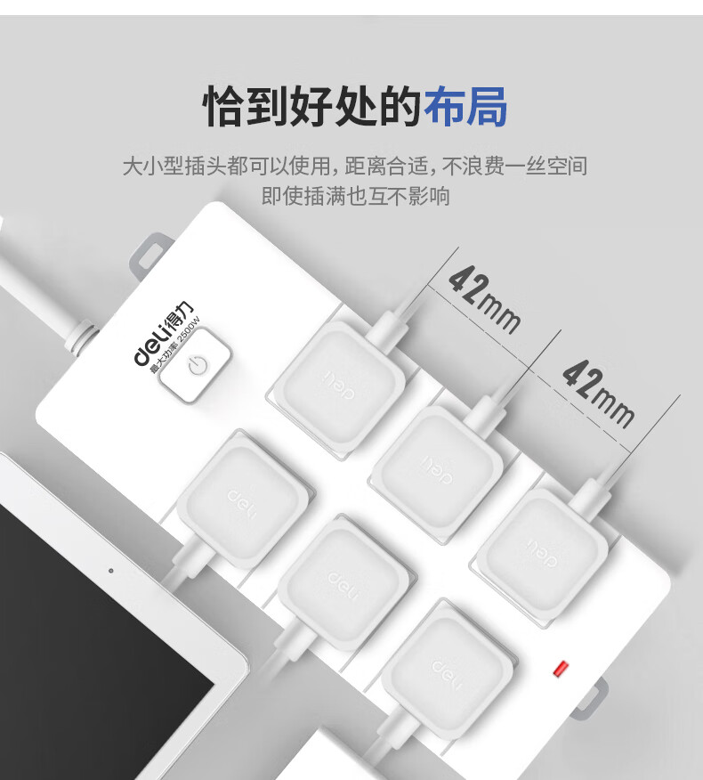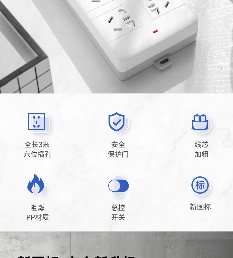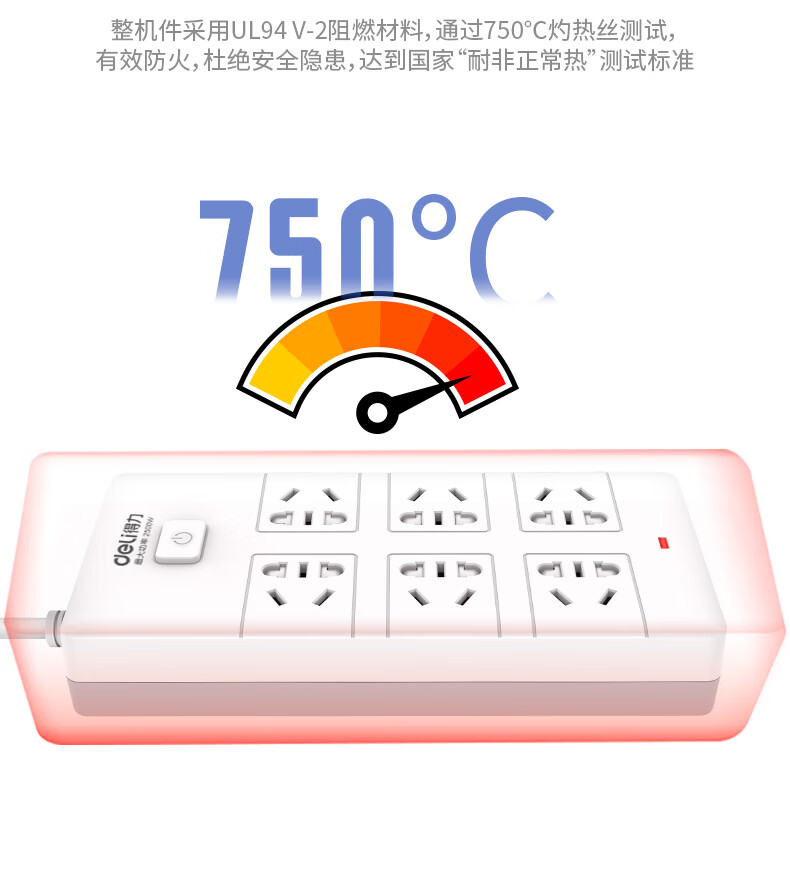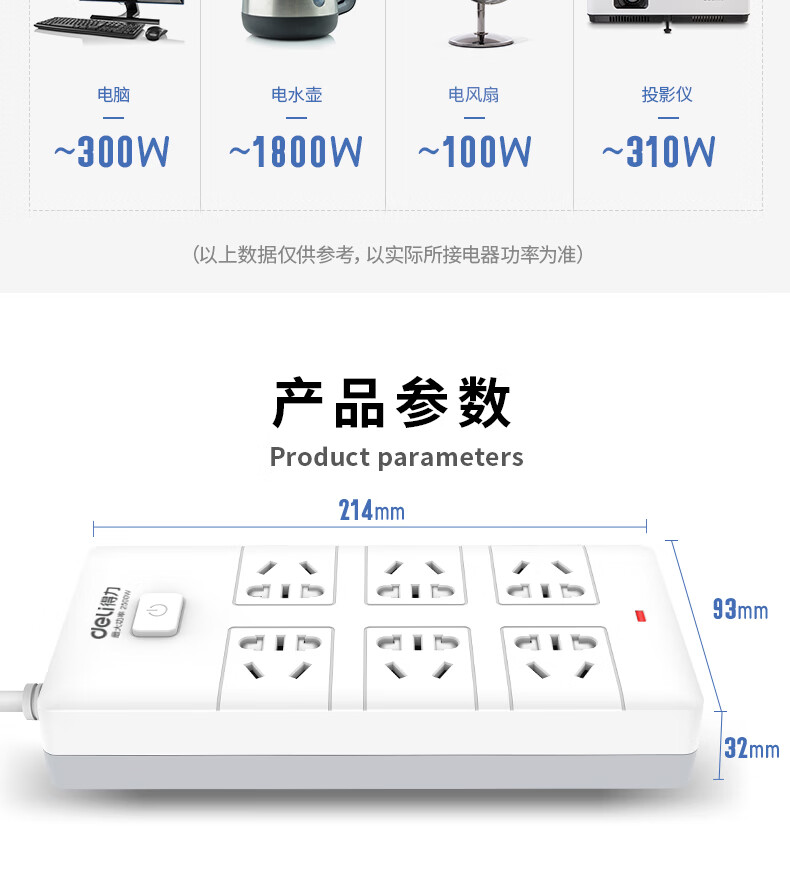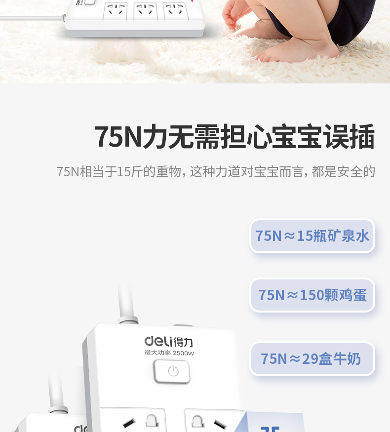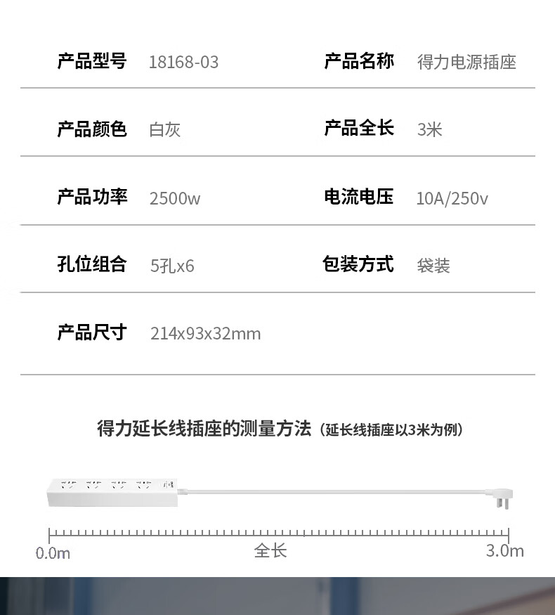 得力(deli) 总控开关 安全门保护插排 新国标插排 插座 接线板 插线板 (6组合插孔 全长3米)18168-03 自营