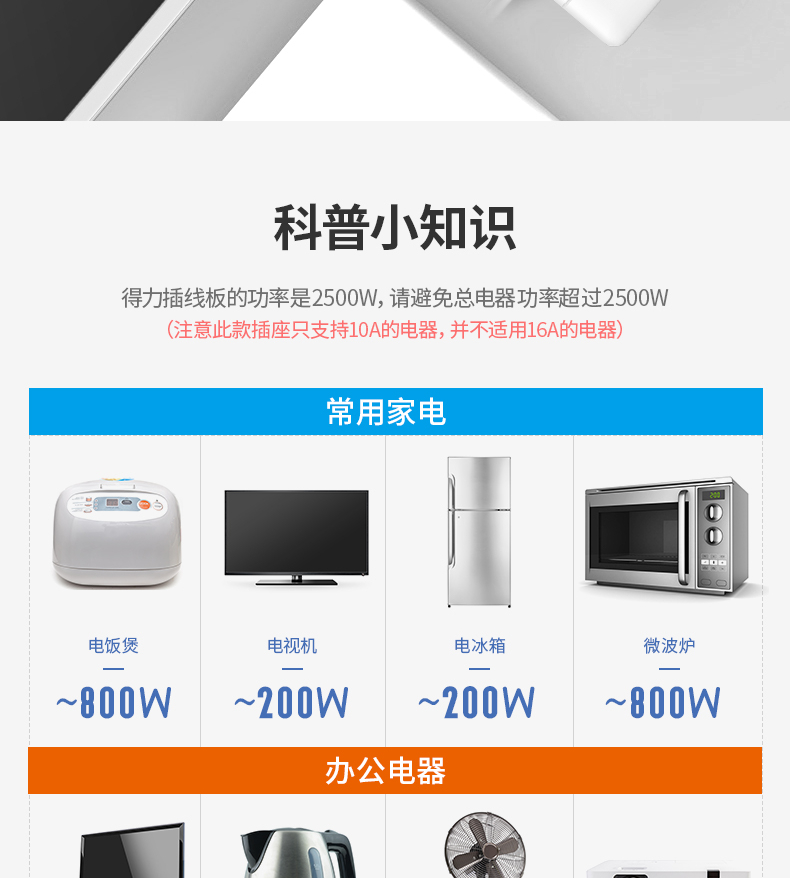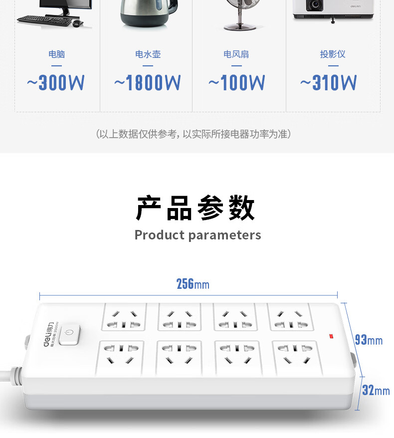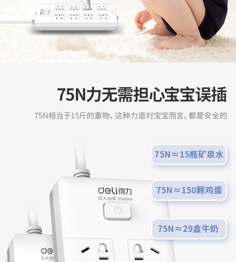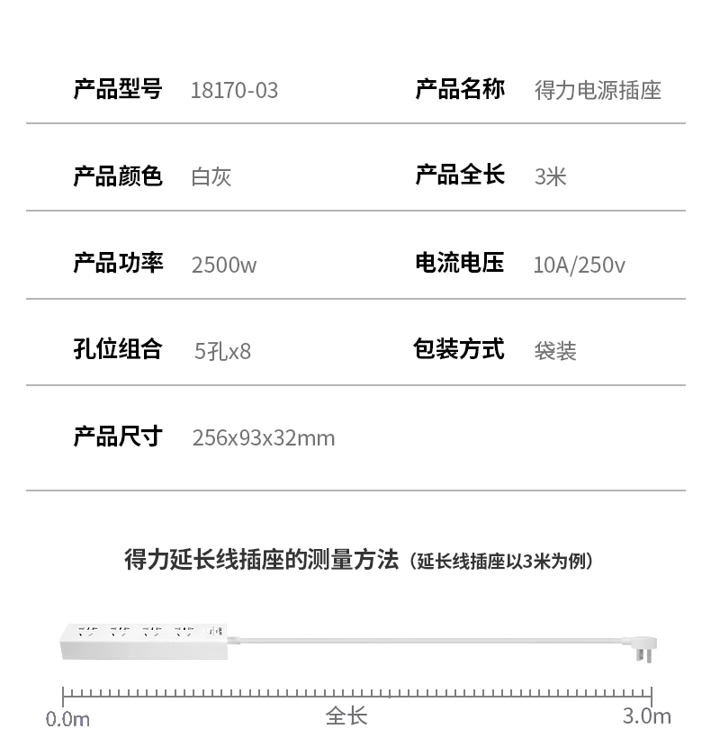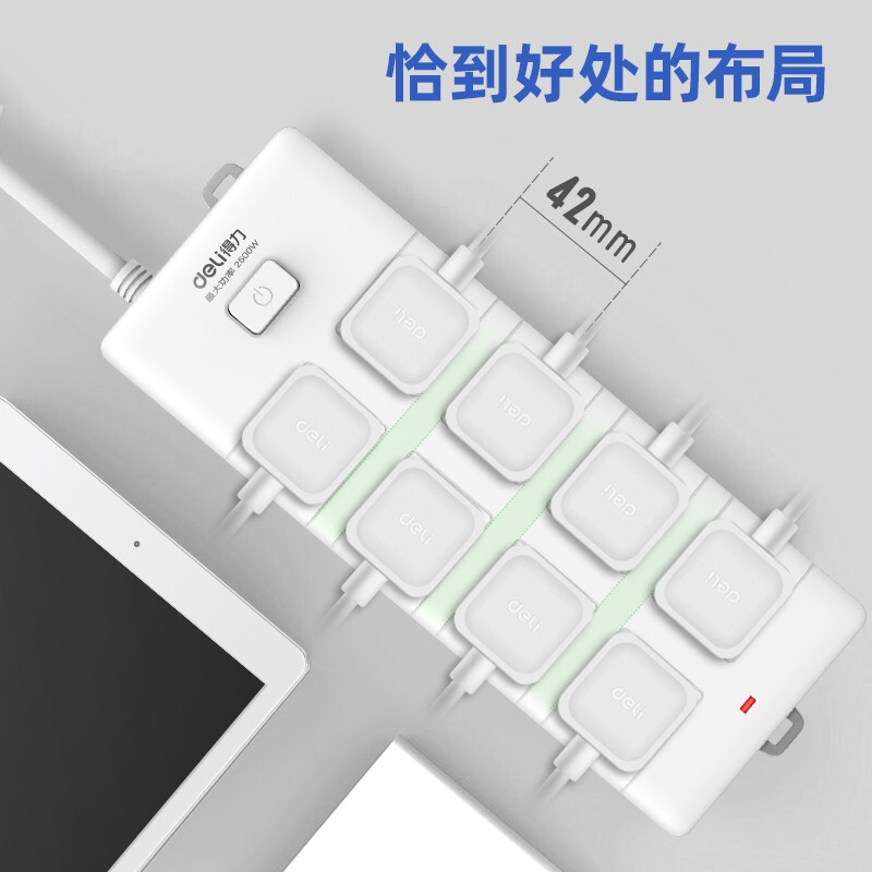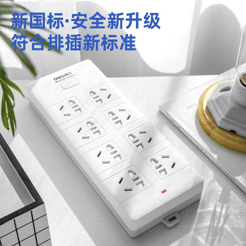 得力(deli)新国标 插排 插座 接线板 插线板 总控开关 安全门保护插排 8组合插孔全长3米 18170-03 自营