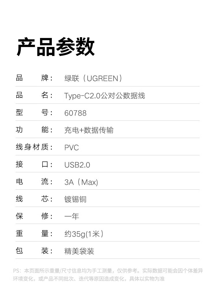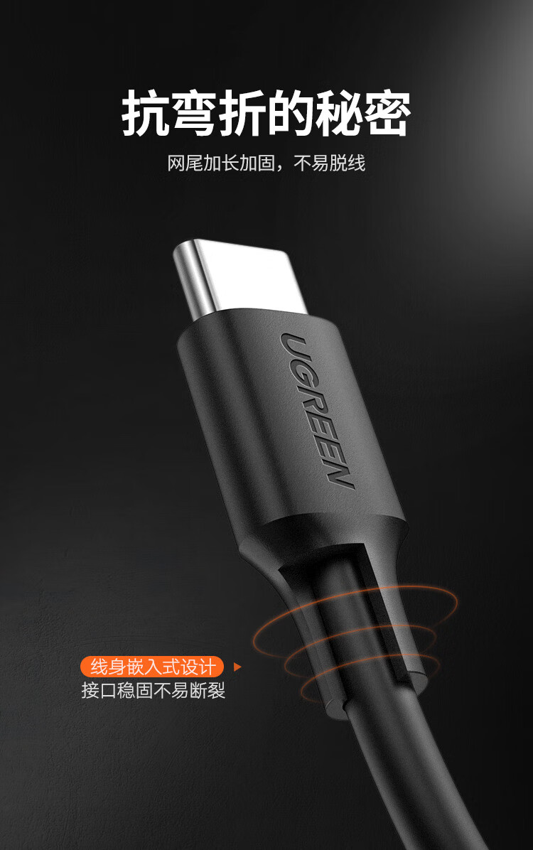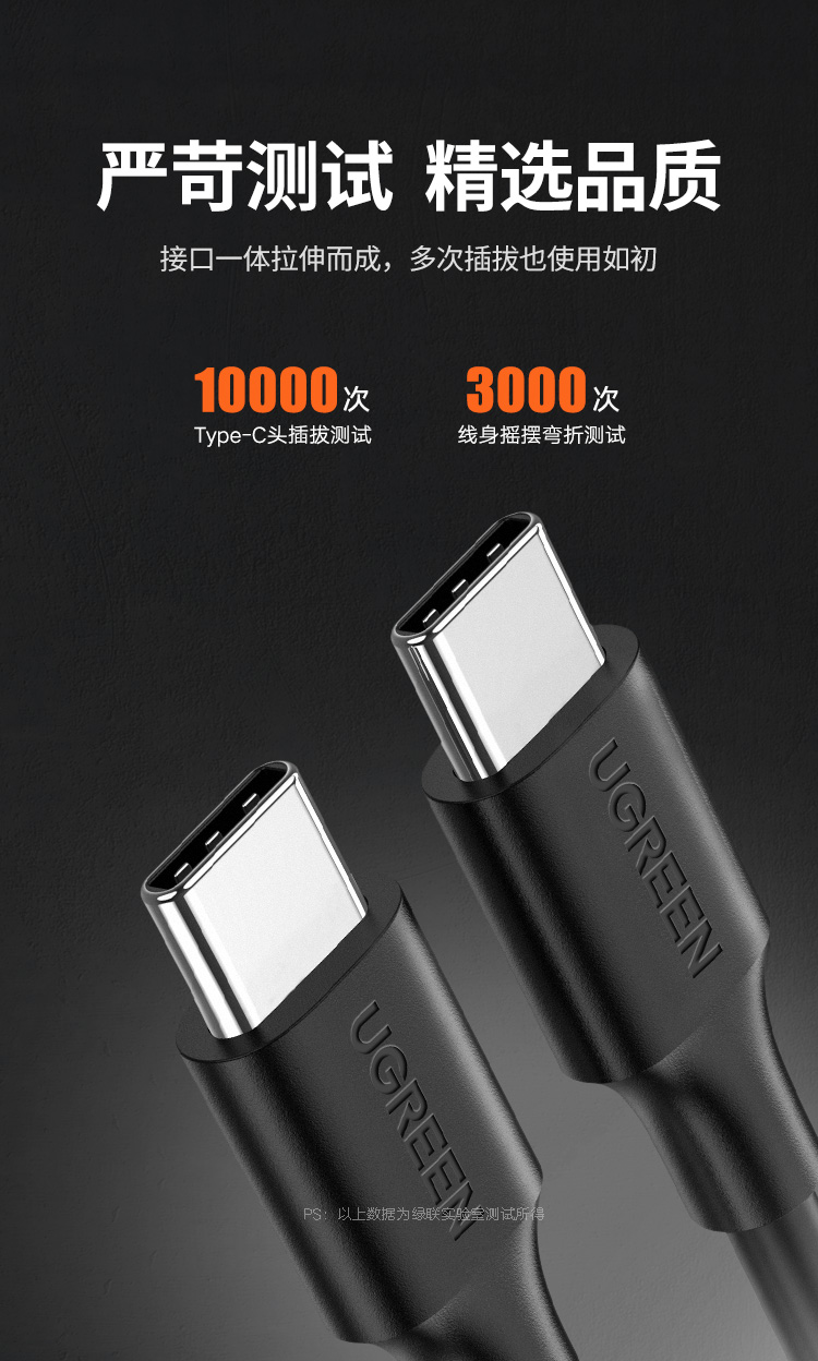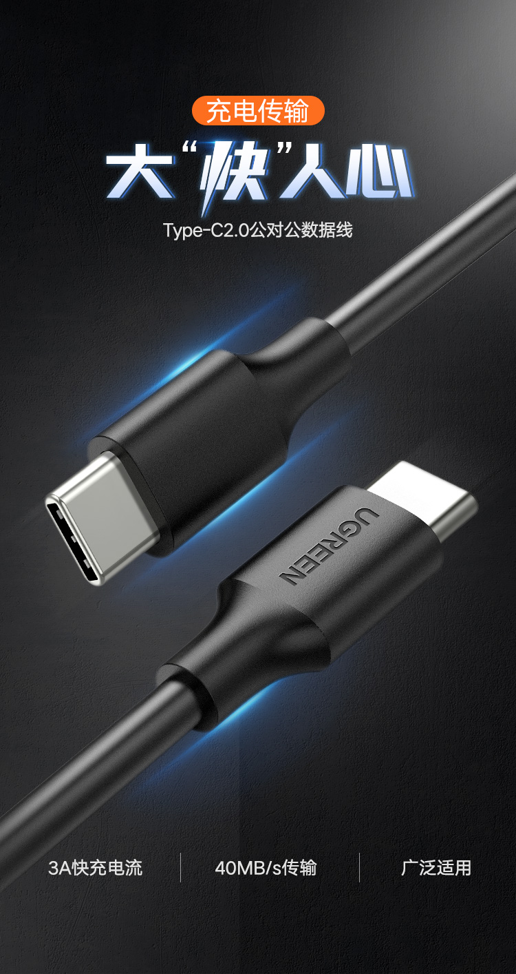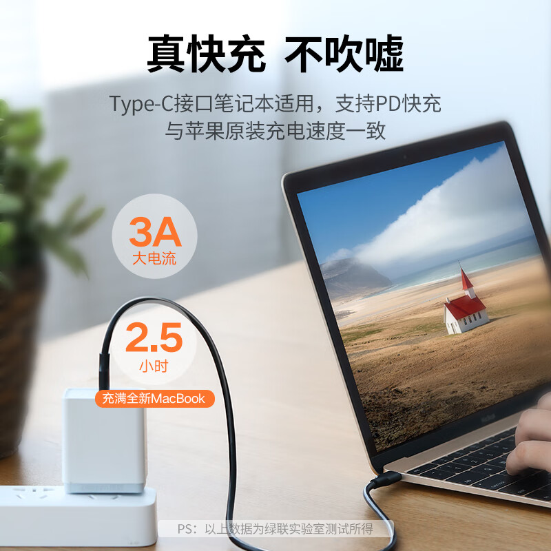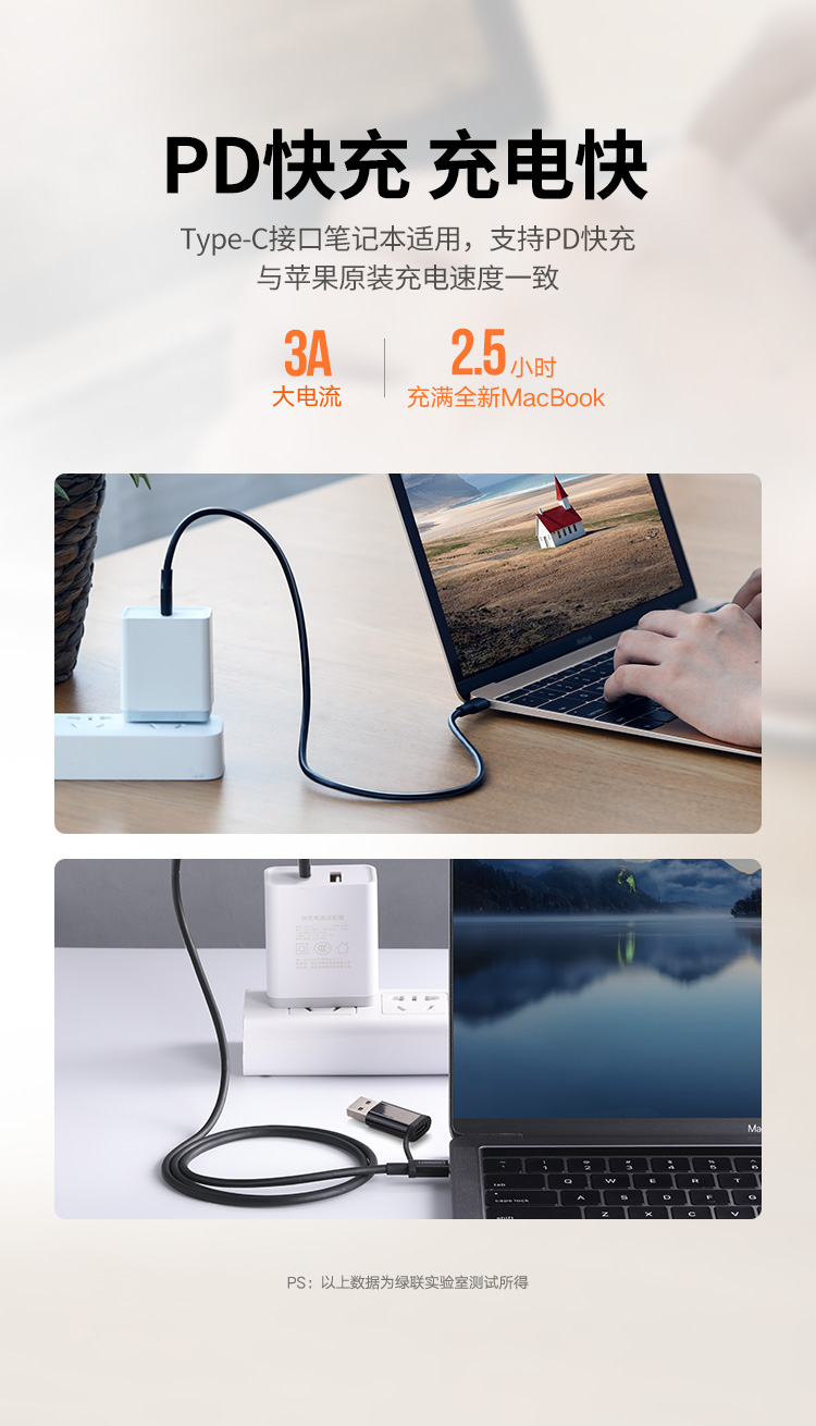- 绿联 Type-C数据线双头PD快充线c to c充电线通用iPadPro苹果MacBook华为笔记本电脑小米安卓手机3m