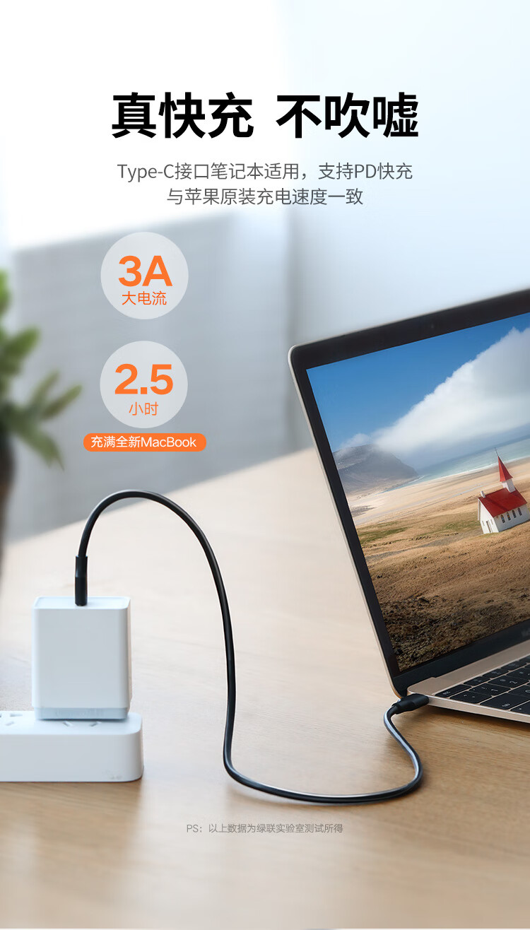 绿联 Type-C数据线双头PD快充线c to c充电线通用iPadPro苹果MacBook华为笔记本电脑小米安卓手机3m 自营