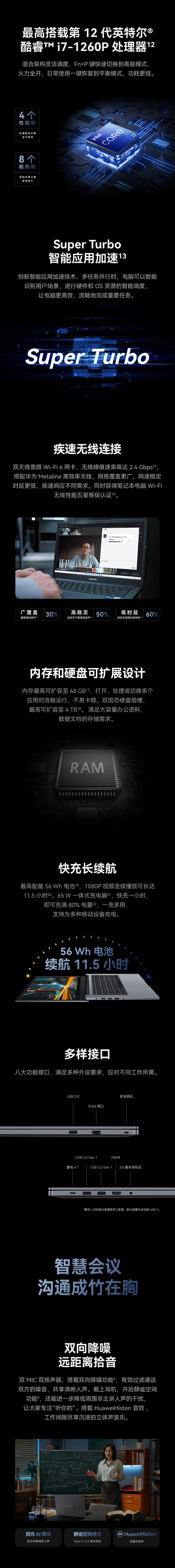 华为笔记本 擎云G540 14英寸高性能轻薄商务笔记本(i5-1240P 16G 512G)深空灰(定制升级) 自营