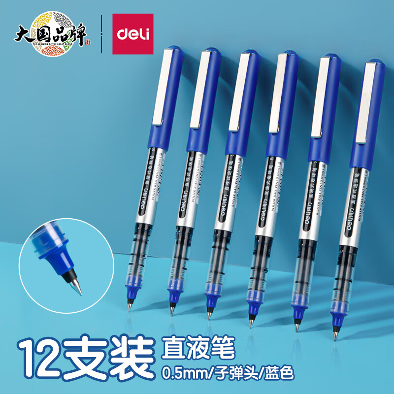 得力(deli)直液笔中性笔 0.5mm子弹头签字笔学生考试笔走珠笔水笔 蓝色 办公用品12支/盒S656