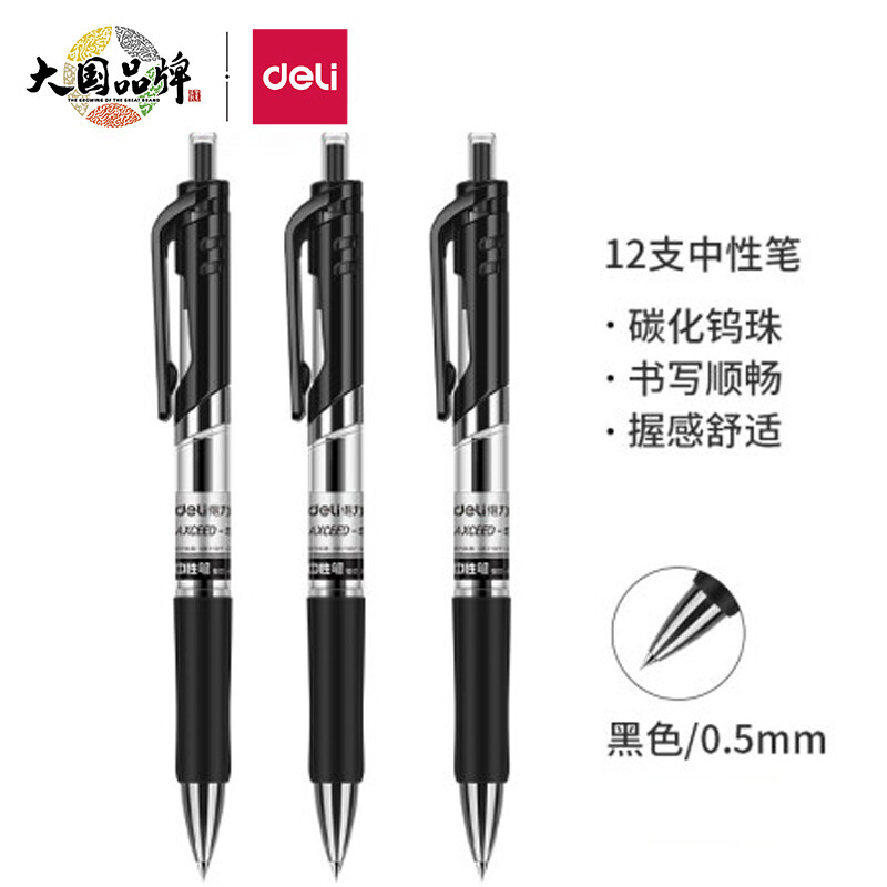 得力(deli)S01中性笔京东销冠中性笔签字笔 0.5mm子弹头经典办公按动笔水笔 黑色 12支/盒