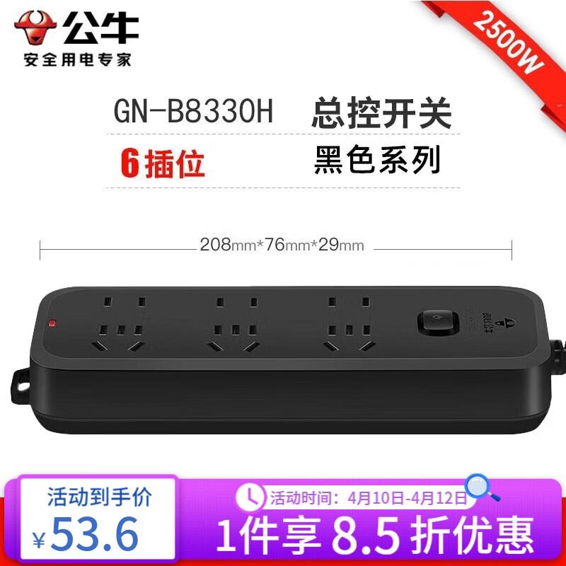 公牛(BULL) 插座黑色插线板家用电线接拖线板插排带线多插位长线插板带开关桌面扦插班 6插位-B8330H 全长3米