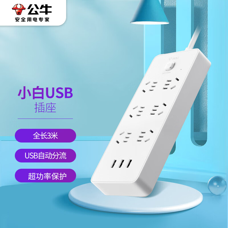 公牛(BULL)超功率保护 新国标公牛小白USB插座/插线板/插排/排插 GNV-UUN153 3usb接口 6孔全长3米