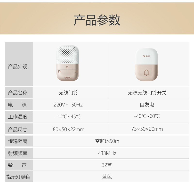 公牛(BULL)门铃 无源无线门铃开关无线远程家用门铃带音乐开关面板一拖一组合GWM03 自营