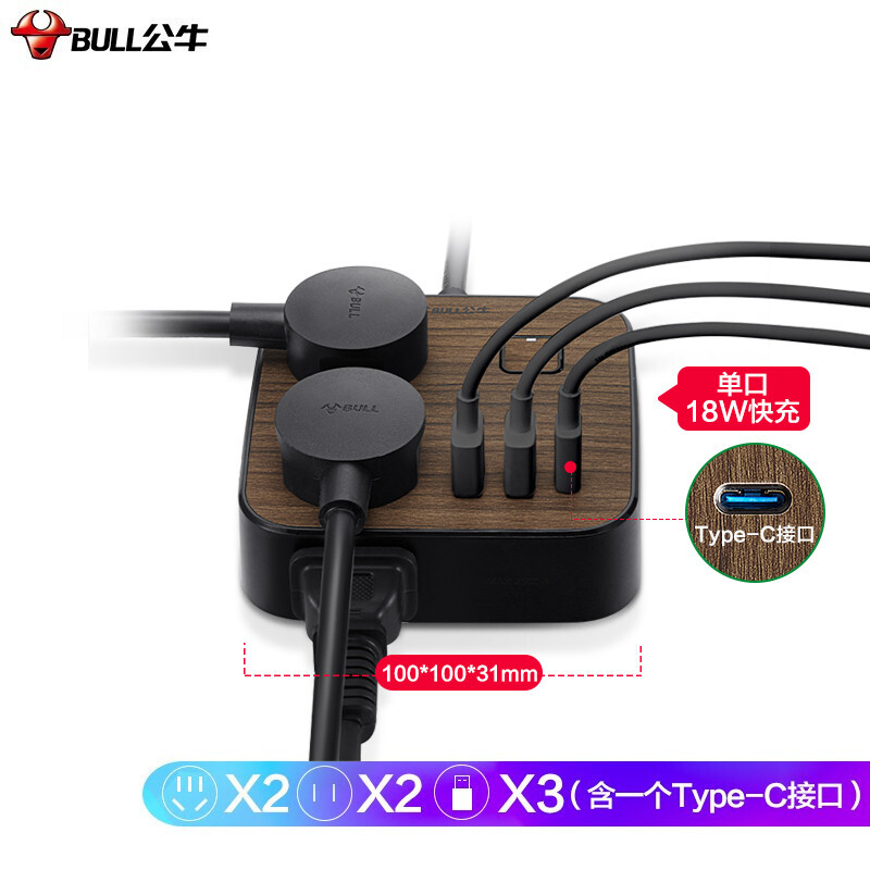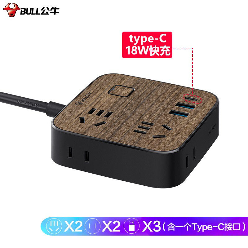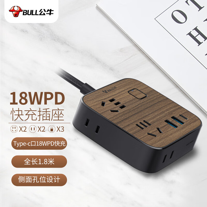 公牛(BULL)18W苹果PD快充插座/插线板/插排/接线板/拖线板 3USB+4孔 黑色木纹全长1.8米 GN-R322U 自营
