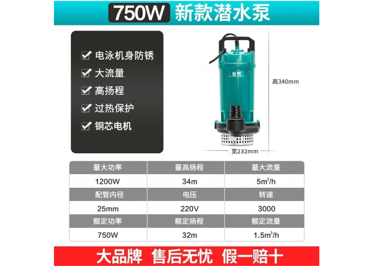新界潜水泵家用水泵高扬程抽水泵农用灌溉喷灌泵抽水机水井水塔清水泵增压泵220V 750W/一寸潜水泵 自营
