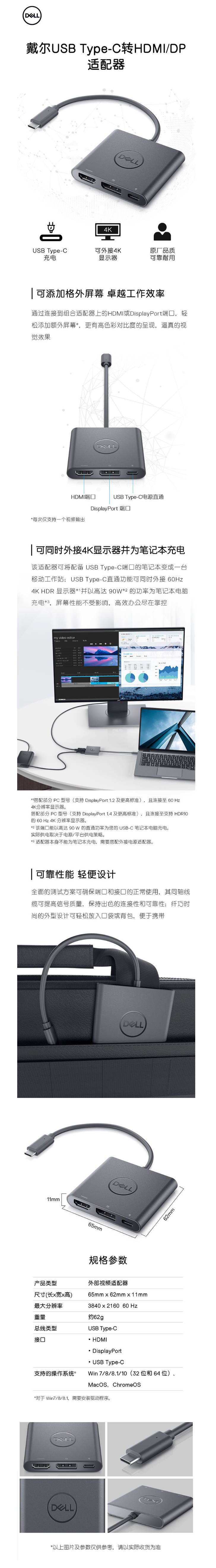 戴尔(DELL)可直通电源的 USB Type-C转HDMI/DP适配器 外部视频适配器 自营