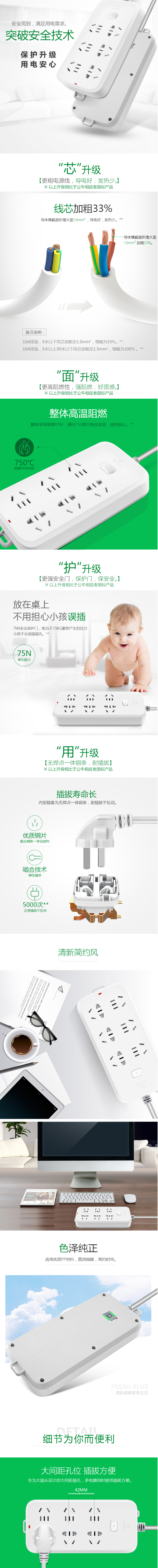 公牛插座防触电多功能3米5米电源加长插座多孔8孔10插孔位延长线插排二孔位1.8米B5110 自营