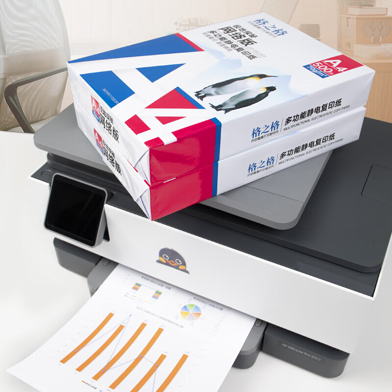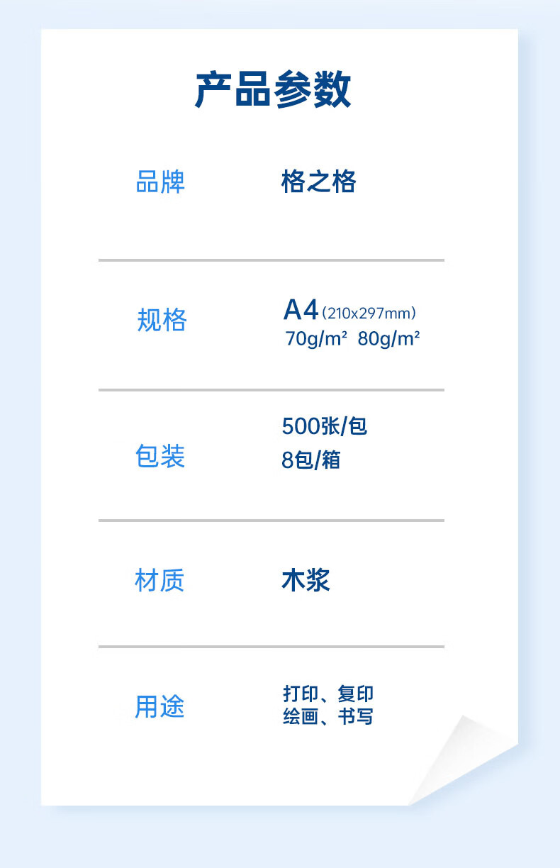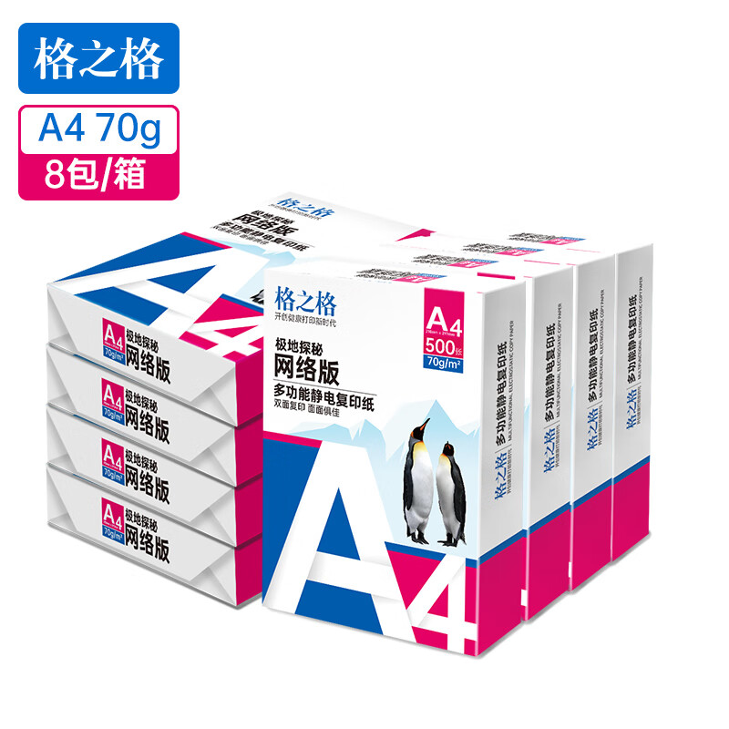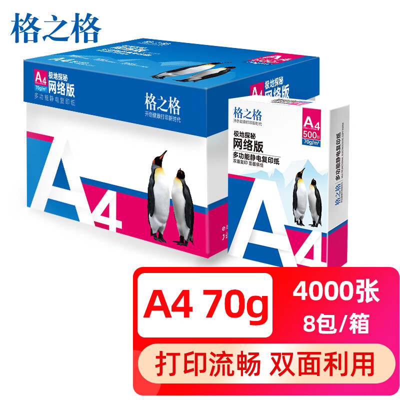 格之格 A4打印纸 A4纸 70g复印纸 多功能静电商用双面打印纸 光滑不易卡纸 500张/包 8包1箱(整箱4000张) 自营