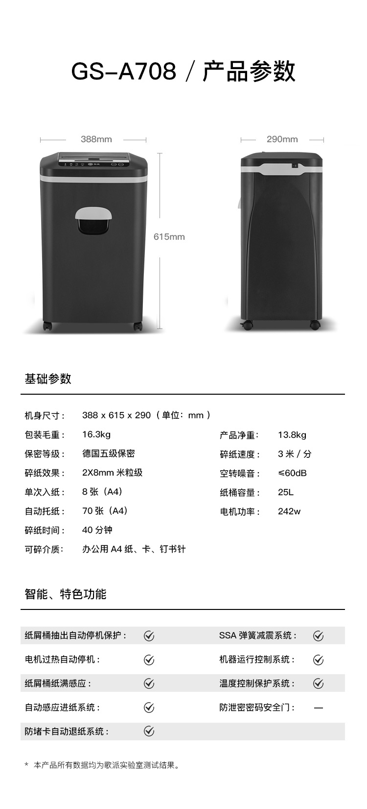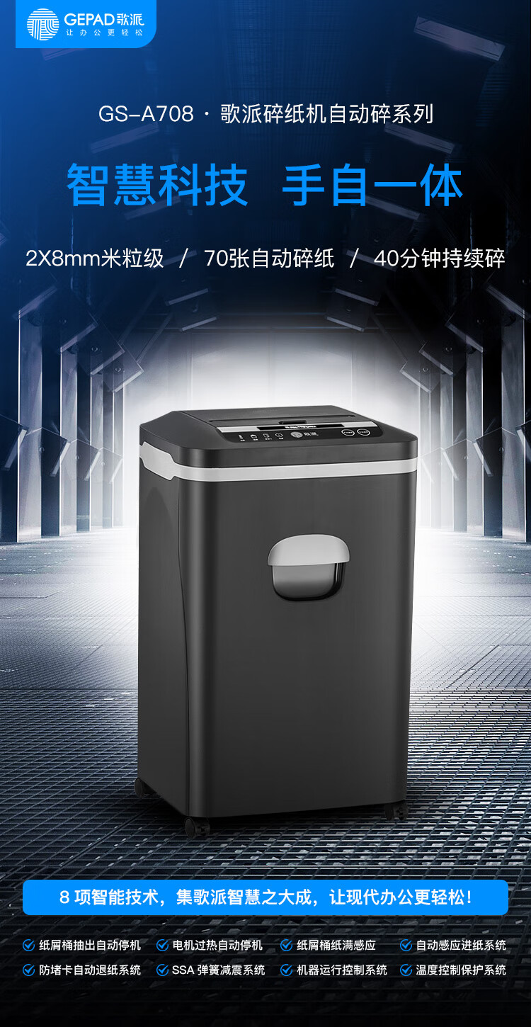 歌派(GEPAD)5级保密办公商用全自动碎纸机(手动8张/自动70张 持续40分钟 25L可碎卡)GS-A708 自营