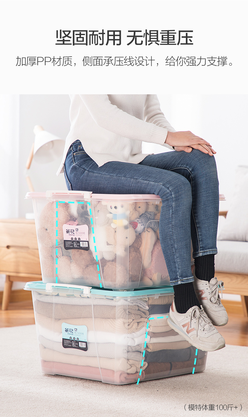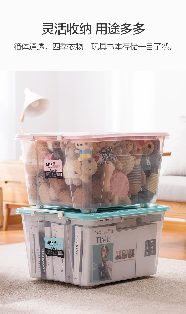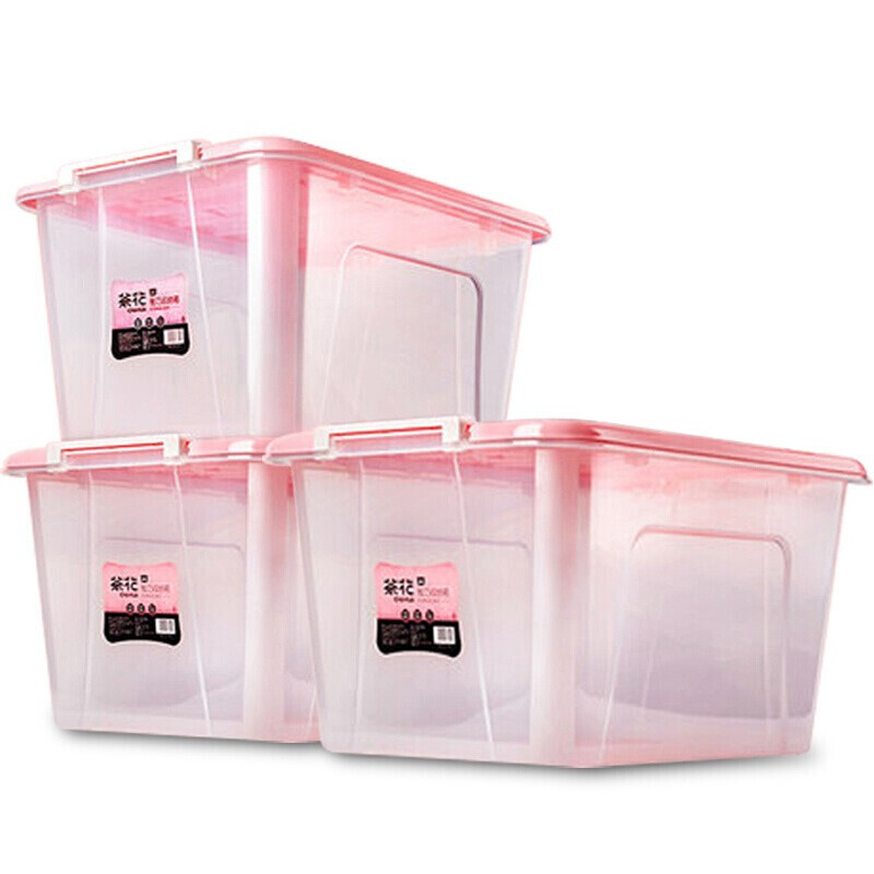 茶花 收纳箱大号 衣服储物箱 衣物棉被整理箱子 玩具塑料箱透明86L 粉 3支装 自营