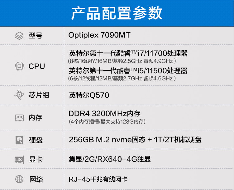 戴尔(DELL) 台式机7090MT Optiplex商用办公电脑主机 标配11代i7/16/256+2/2G 自营