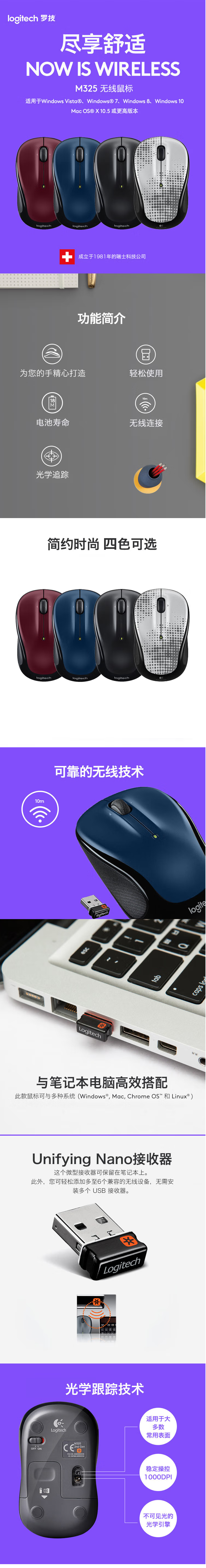 罗技(Logitech) M325无线鼠标 急速滚轮笔记本台式电脑USB便携优联办公鼠标 黑色 自营